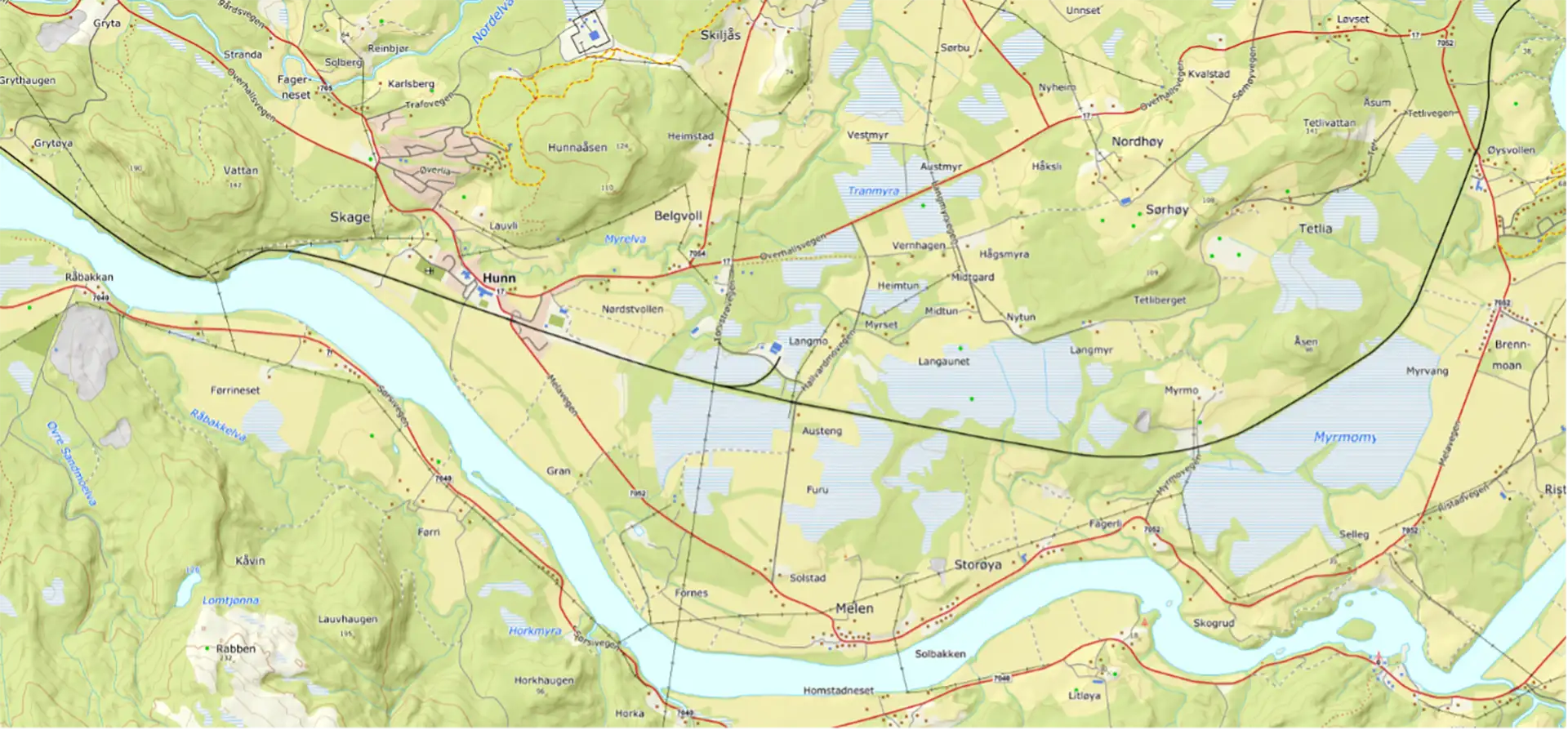 Den store elva (nederst på kartet) er Namsen (utt. namsinj). Skrivemåten avviker fra «den nedervde lokale uttalen», jf stadnamnlova § 4. Namnet skrives tidvis for Namsin og det passer bedre. Den mindre elva øverst på kartet heter Myrelva fordi den kommer fra myrområdet øst for Hunn – omtales nærmere nedenfor. Nord for gårdene ligger skogsområdet Hunnaåsen (utt. hoinna’åsn). Gerhard Schøning var i 1774 Justits-Raad og seinere professor i København. Besøket er beskrevet i Schønings 3-bindsverk – Reise Giennem en Deel af Norge 1773-75 (bind 2) som han skrev etter mottatt pengestøtte fra Kongen i København. Schøning anslo samlet antall gravhauger på Hunn til ca. 50. Hauger sør i Hunnamoen var ikke medtatt og neppe de i Hunnaåsen (Nord-/Sørmarka).