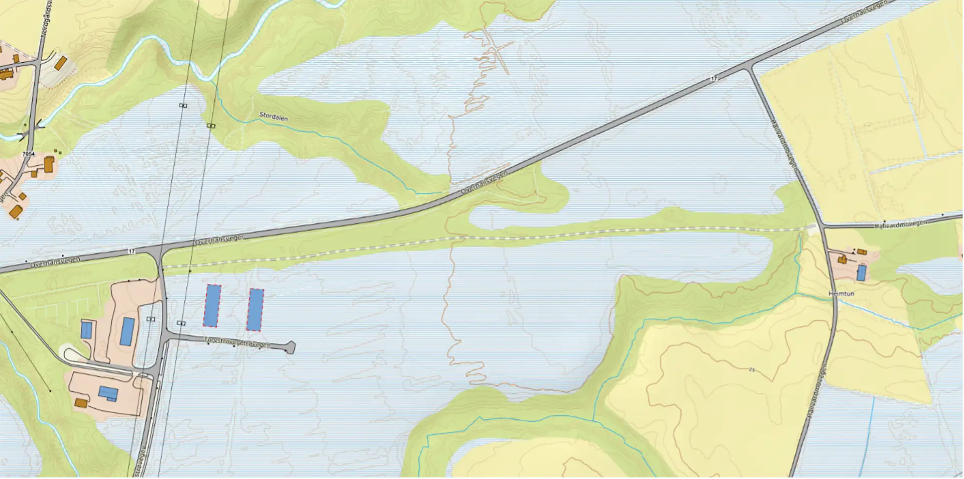 Skissen viser at elveløpet til Namsen har endret seg ved at det gikk et løp på innsida av Førri-øya (også kalt Hallvardmoøya). Landhevinga har fjernet dette elveløpet nedenfor skråninga (kalt reina) ned fra Gåsmoen (utt. gåsmo’n), men det er fortsatt fuktig der (slike steder kalles lokalt for lorn/lornet).